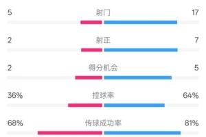 kaiyun-伯恩茅斯1-2曼城全场数据:射门5-17,射正2-7,控球率36%-64%
